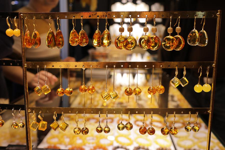 7日、バルト海の琥珀のピアス。(上海=新華社記者/藍建中)