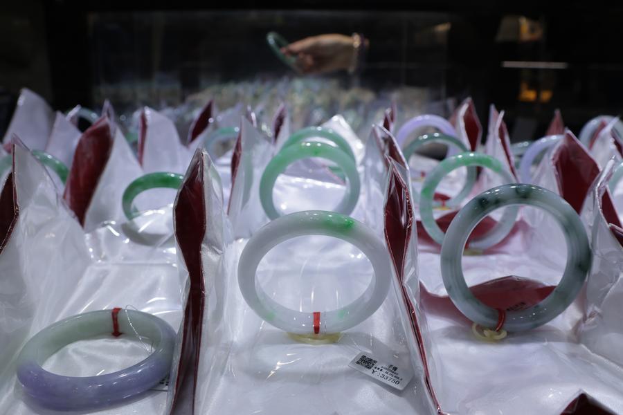 8日、ミャンマーの翡翠(ひすい)の腕輪。(上海=新華社記者/藍建中)