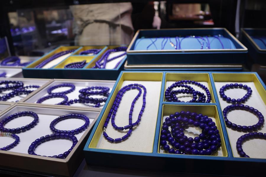 8日、アフガニスタンの青金石(ラピスラズリ)のブレスレットとネックレス。(上海=新華社記者/藍建中)
