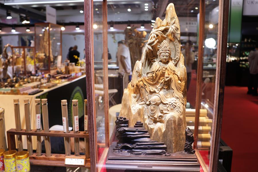 8日、ベトナムの沈香(香木の一種)でできた観音木彫像。(上海=新華社記者/藍建中)