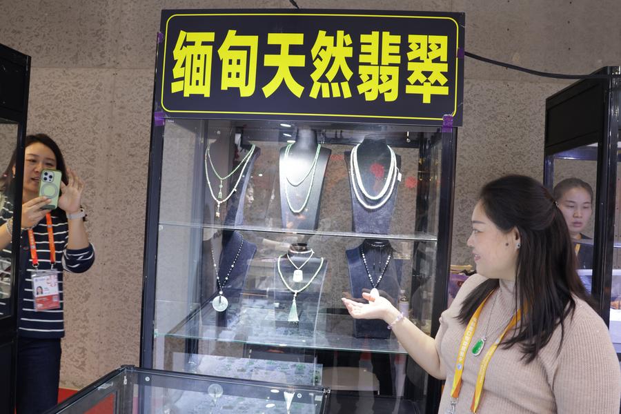 8日、ミャンマーの天然翡翠(ひすい)のアクセサリーについて解説するスタッフ。(上海=新華社記者/藍建中)