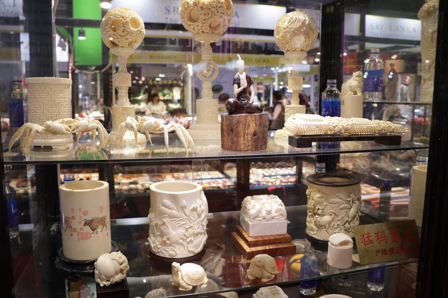 7日、ロシアのマンモスの牙でできた工蕓品。(上海=新華社記者/藍建中)
