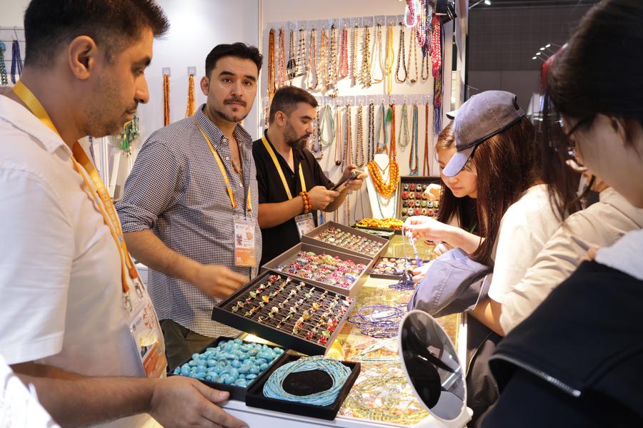 8日、アフガニスタンの寶飾品を品定めする來場者。(上海=新華社記者/藍建中)