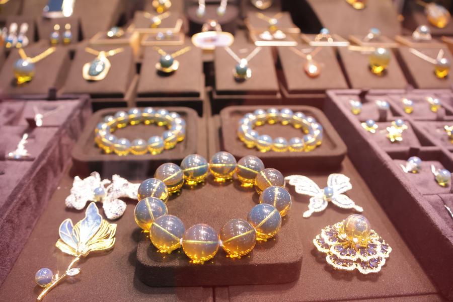8日、ドミニカ共和國のブルーアンバーのアクセサリー。(上海=新華社記者/藍建中)