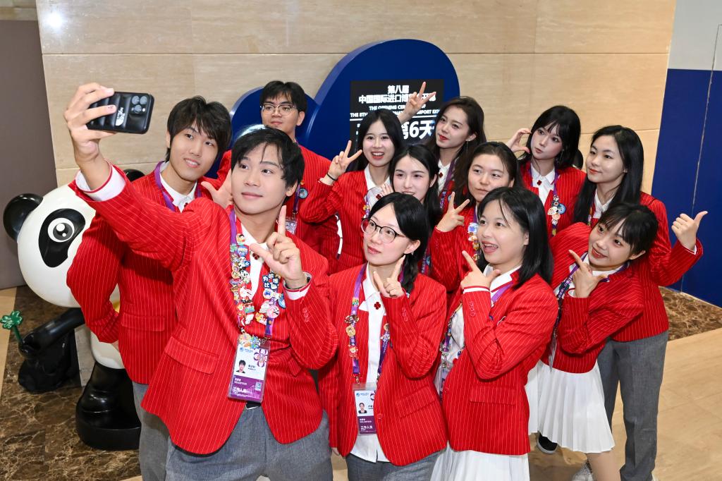 10日、第8回輸入博のプレスセンターで、記念撮影するボランティア。(上海=新華社記者/陳浩明)