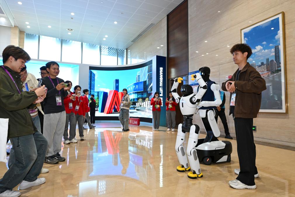 10日、第8回輸入博のプレスセンターで、ロボットと記念撮影するスタッフ(右)。(上海=新華社記者/陳浩明)