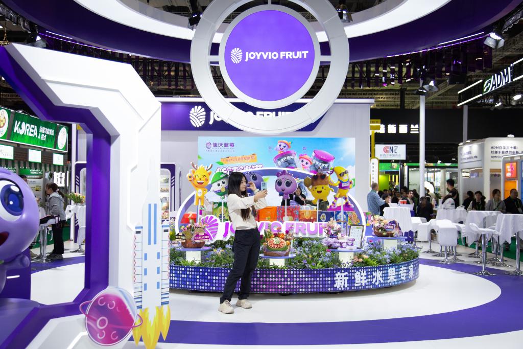 10日、第8回輸入博の食品・農業製品エリアで、自撮りをする人。(上海=新華社記者/田薇薇)