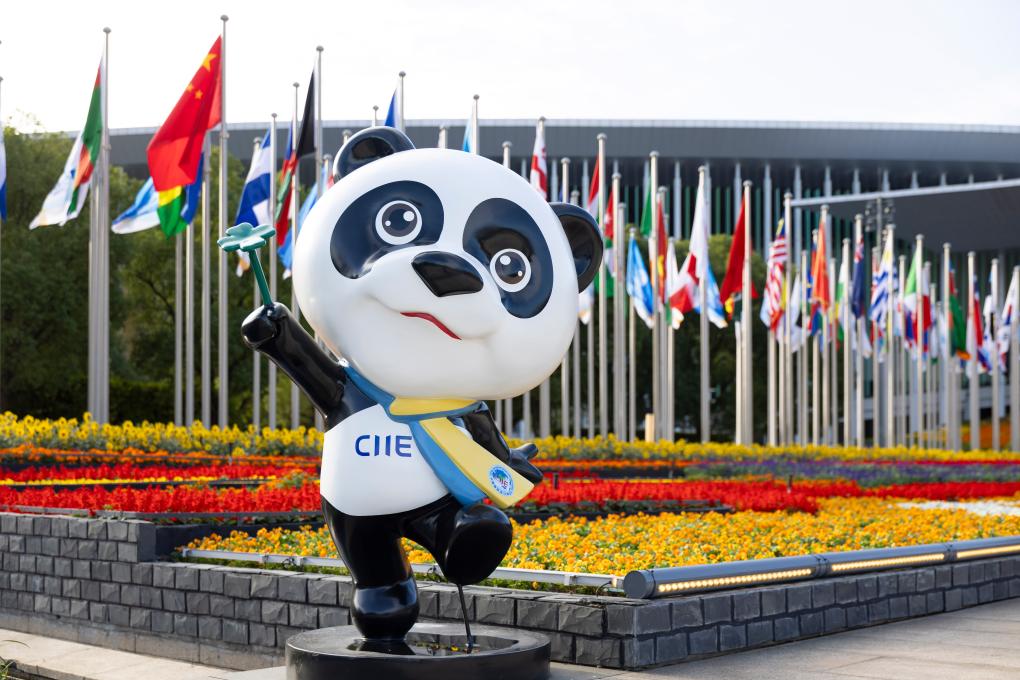 10日、國家エキシビション・コンベンションセンター(上海)の南広場に設置された輸入博マスコット「進寶(ジンバオ)」。(上海=新華社記者/王翔)
