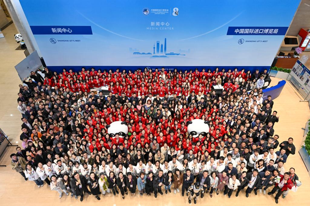 10日、第8回輸入博のプレスセンターで、集合寫真を撮るボランティアとスタッフ。(上海=新華社記者/陳浩明)