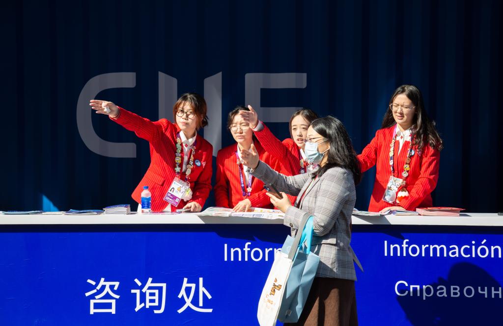 10日、國家エキシビション・コンベンションセンター(上海)で、來場者に道案內をするボランティア。(上海=新華社記者/田薇薇)
