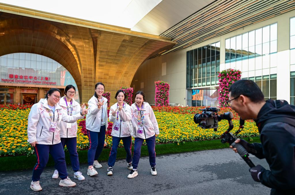 10日、國家エキシビション・コンベンションセンター(上海)で記念撮影するボランティア。(上海=新華社記者/蔡湘鑫)