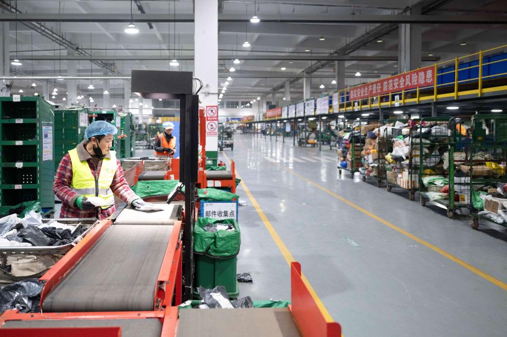 10日、中國郵政集団黒竜江省ハルビン郵區センターで荷物を仕分けるスタッフ。(ハルビン=新華社記者/張濤)