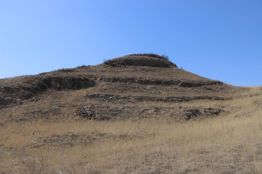 今回の考古學調查で発見された「楡1號城」の最上部の石積み。(西安=新華社配信)