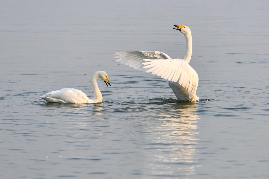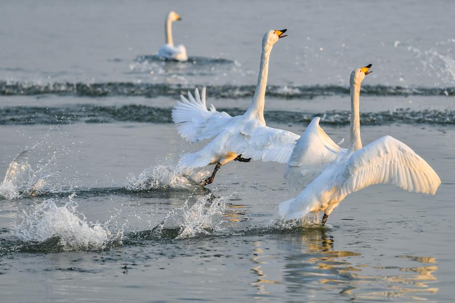 12日、運城市平陸県の黃河濕地で戯れるオオハクチョウ。(運城=新華社記者/曹陽)