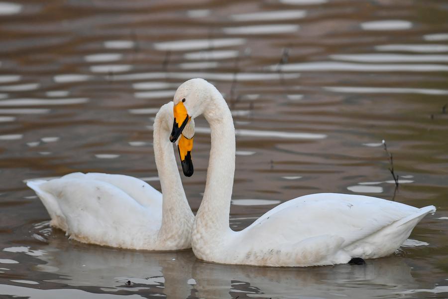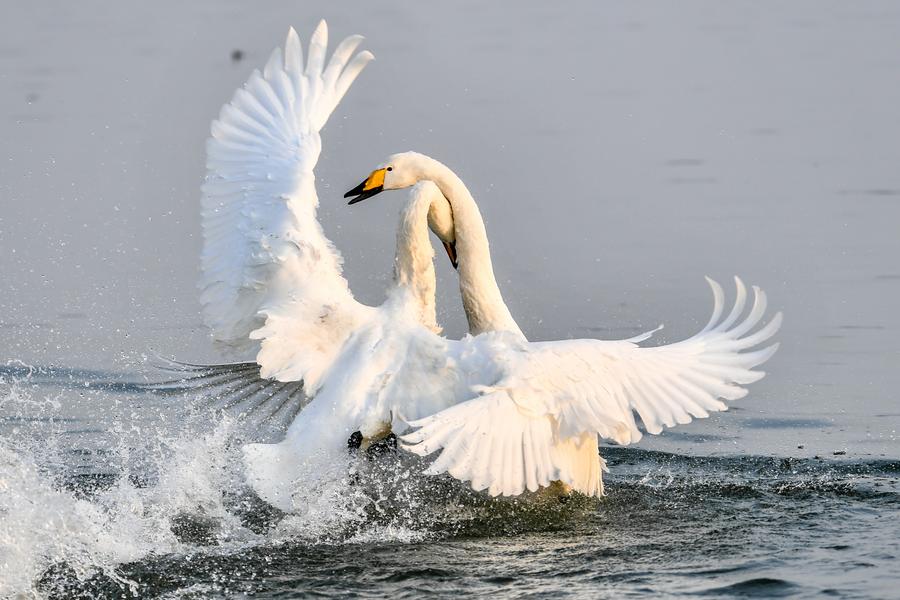 13日、運城市平陸県の黃河濕地で戯れるオオハクチョウ。(運城=新華社記者/曹陽)