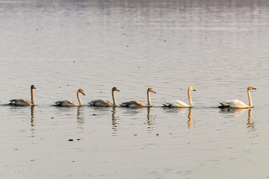 11日、運城市平陸県の黃河濕地で羽を休めるオオハクチョウ。(運城=新華社記者/曹陽)