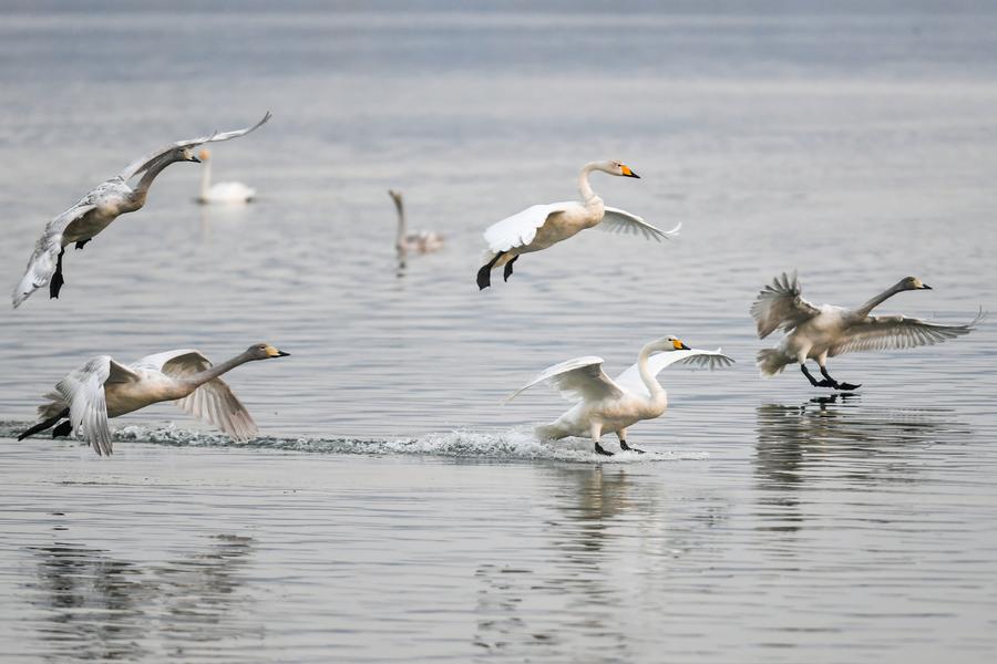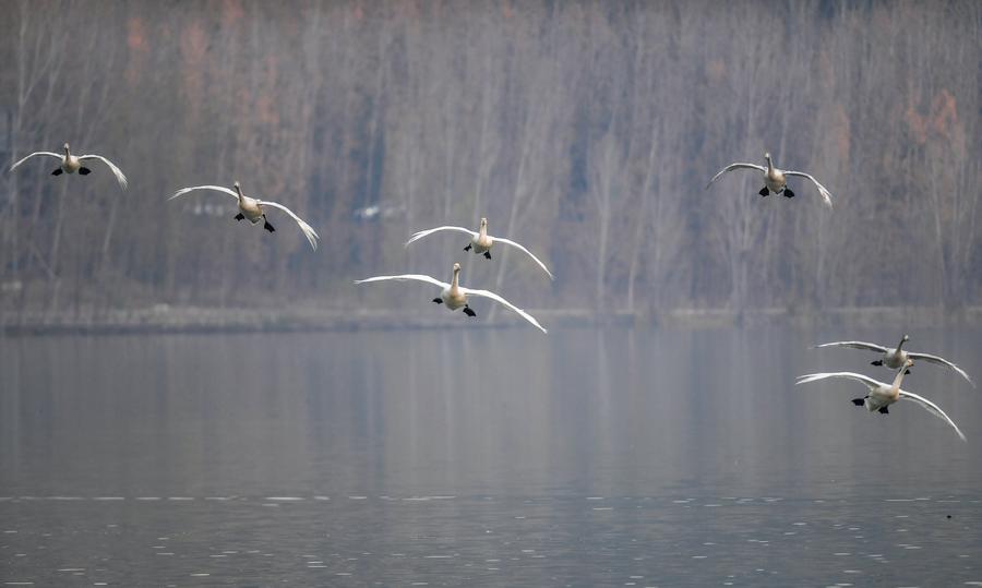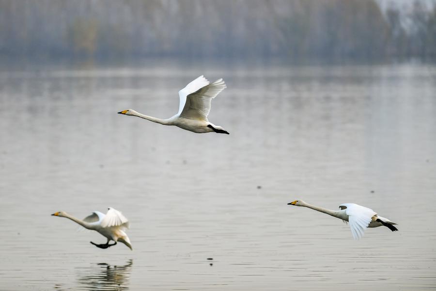 11日、運城市平陸県の黃河濕地を飛ぶオオハクチョウ。(運城=新華社記者/曹陽)