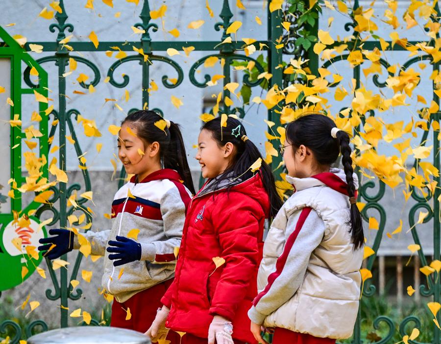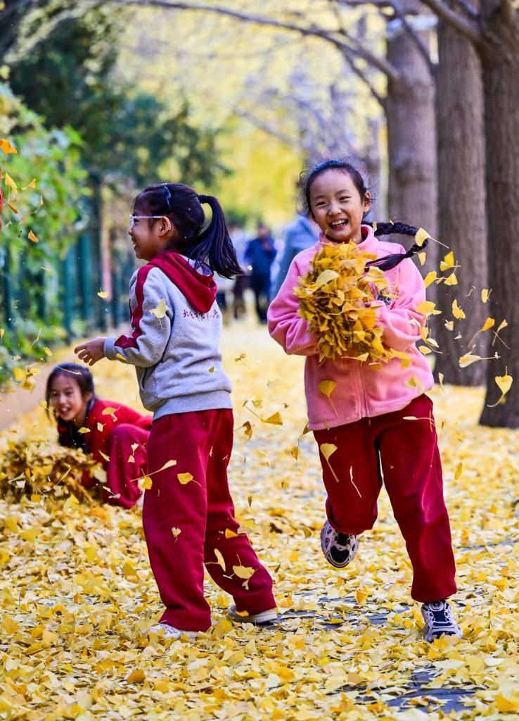 12日、北京市西城區の什坊小街で、イチョウの葉を投げて遊ぶ子どもたち。(北京=新華社記者/陳曄華)
