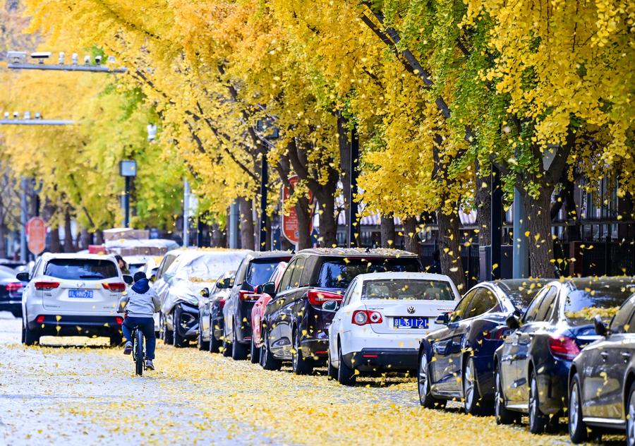 12日、北京市西城區什坊(じゅうぼう)小街に舞う落葉。(北京=新華社記者/陳曄華)