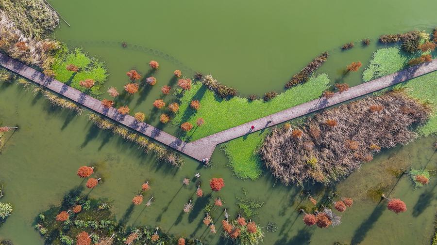 12日、江蘇省徐州市の九里湖國家濕地公園。(ドローンから、徐州=新華社配信/白雪)