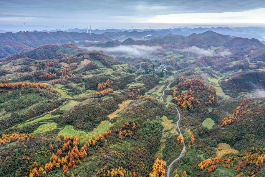 12日、湖南省湘西トウチャ族ミャオ族自治州竜山県翻身村の風景。(ドローンから、湘西=新華社配信/曾祥輝)
