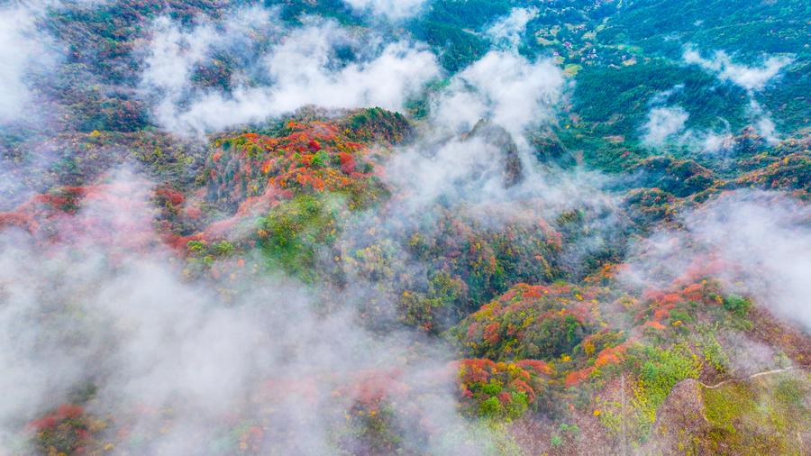 12日、四川省達州市宣漢県の巴山大峽谷に立ち込める雲海。(ドローンから、達州=新華社配信/張平)