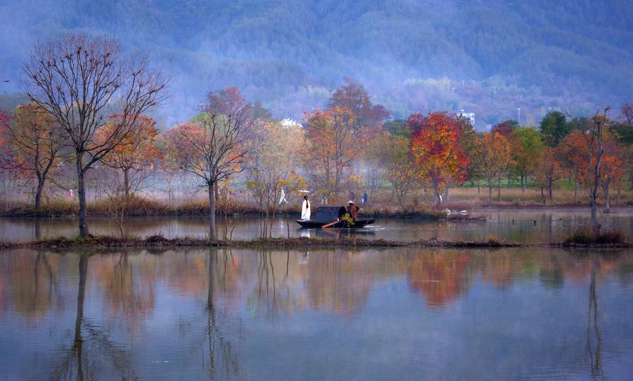 12日、湖北省黃岡市羅田県の河西畈(かせいはん)村で、小舟に乗り紅葉を楽しむ人。(黃岡=新華社配信/文振効)