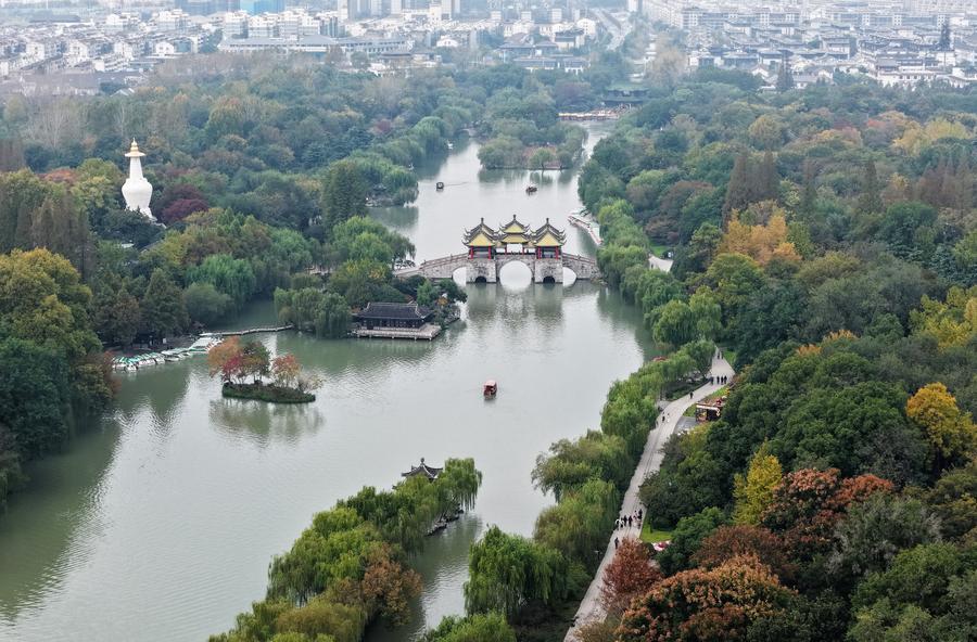 12日、江蘇省揚州市の瘦西湖風景區。(ドローンから、揚州=新華社配信/孟徳竜)