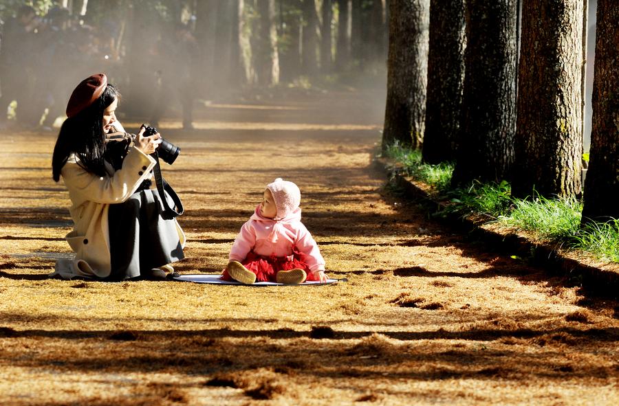 15日、江西省徳興市の大茅山風景區で撮影を楽しむ観光客。(徳興=新華社配信/卓忠偉)