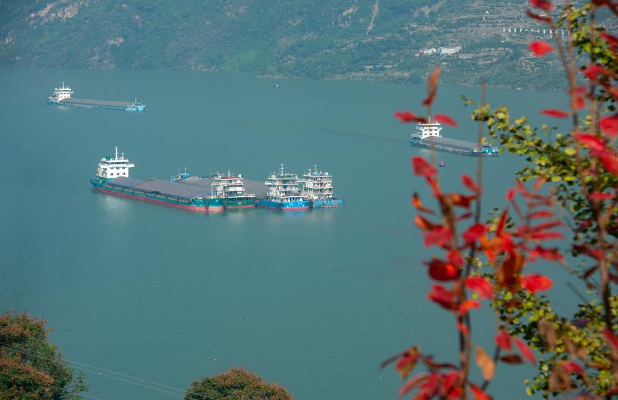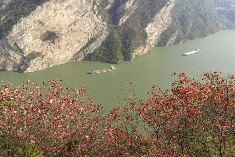 16日、湖北省宜昌市秭帰(しき)県の西陵峽を航行する船。(ドローンから、宜昌=新華社配信/王罡)