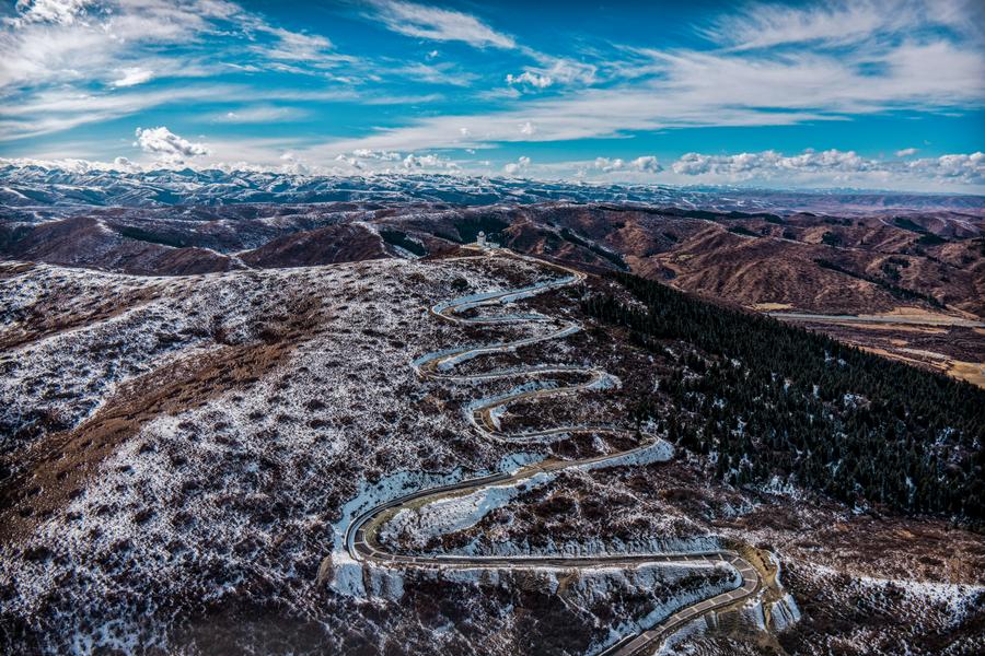 15日、四川省アバ・チベット族チャン族自治州紅原県の道路。(ドローンから、紅原=新華社配信/米林)