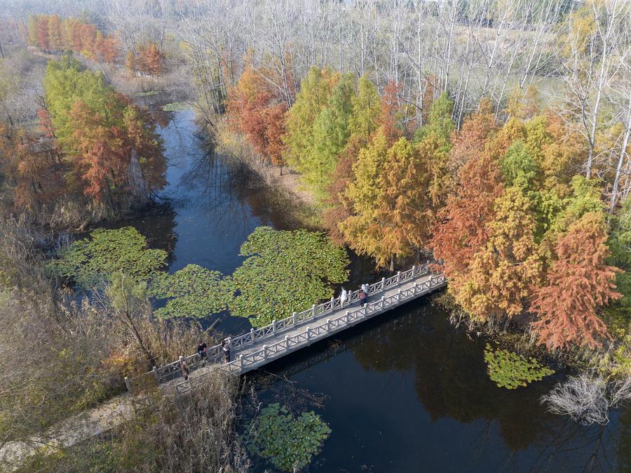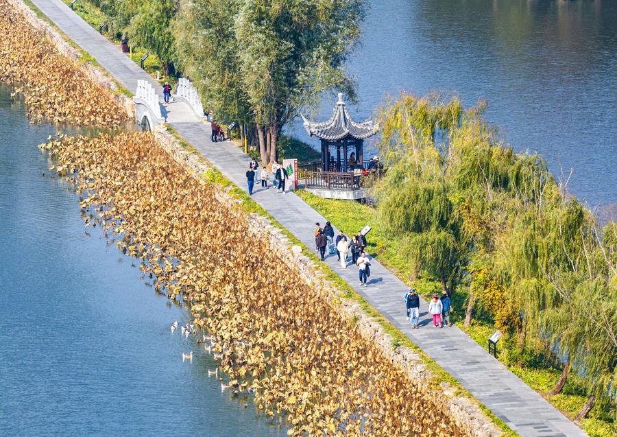 15日、江蘇省興化市の裏下河國家濕地公園を散策する観光客。(ドローンから、興化=新華社配信/周社根)
