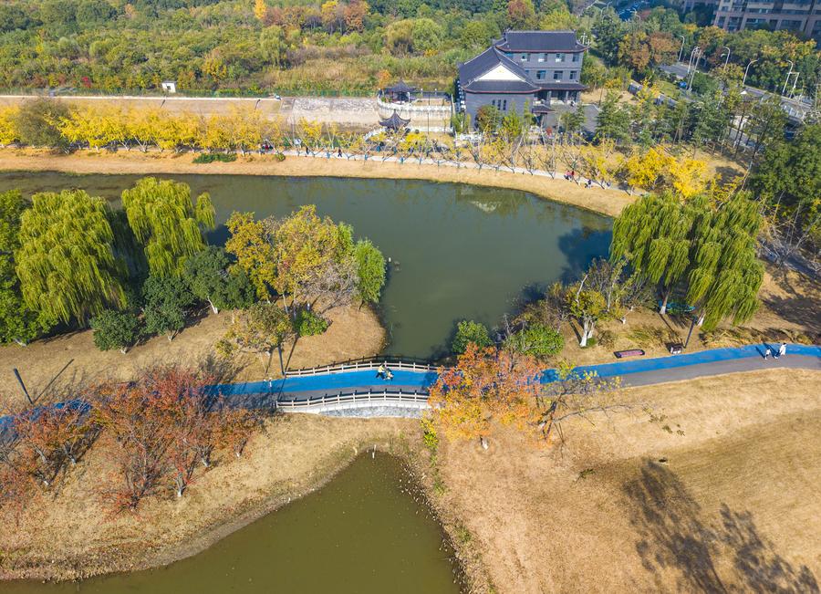 16日、空から見た江蘇省淮安市の古淮河文化生態風景區。(ドローンから、淮安=新華社配信/張建)