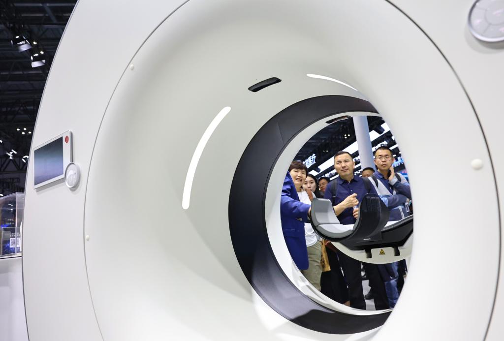 上海市で開かれた第91回中國國際醫療機器博覧會(CMEF)で、コンピューター斷層撮影(CT)裝置を見學する來場者。(4月8日撮影、上海=新華社記者/方喆)
