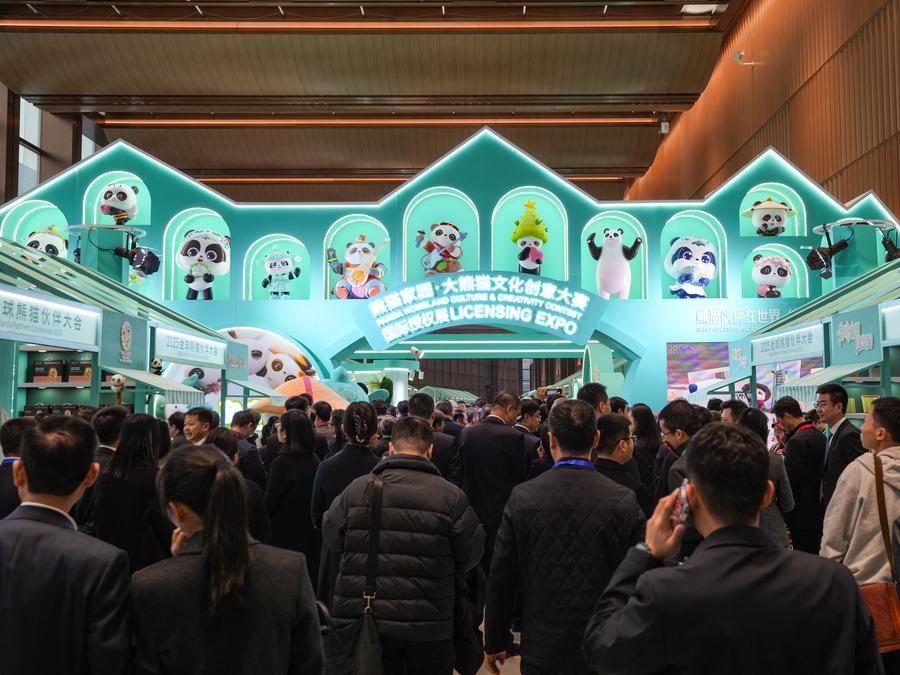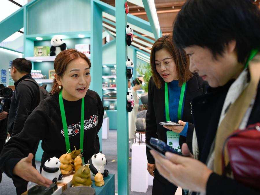 21日、グローバルパンダパートナー大會でパンダ関連の製品を見る來賓。(成都=新華社記者/江宏景)