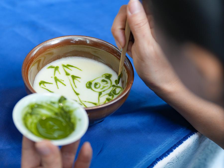 21日、パンダ文化クリエーティブマーケットでパンダのラテアートを描く茶蕓師。(成都=新華社記者/王曦)