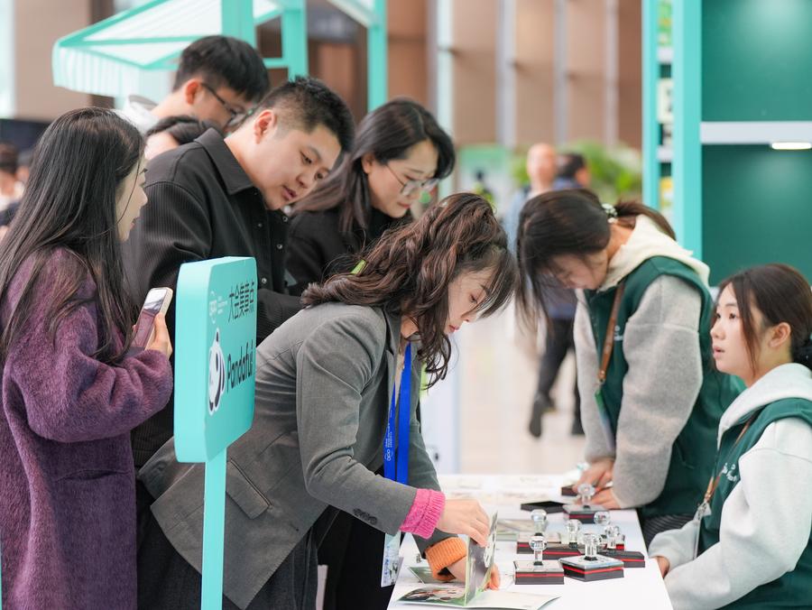 21日、グローバルパンダパートナー大會で展示を見學する來賓。(成都=新華社記者/江宏景)