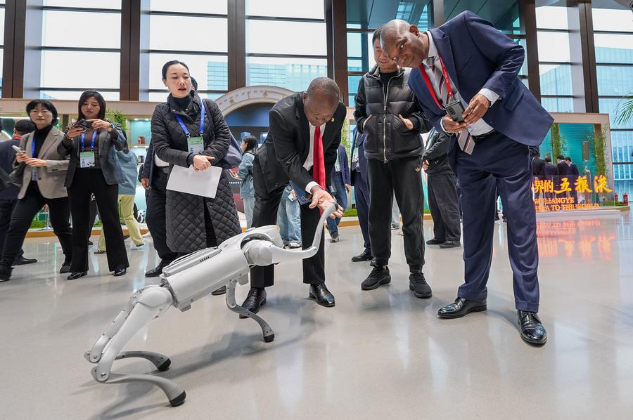 21日、グローバルパンダパートナー大會でロボットと觸れ合う來賓。(成都=新華社記者/江宏景)
