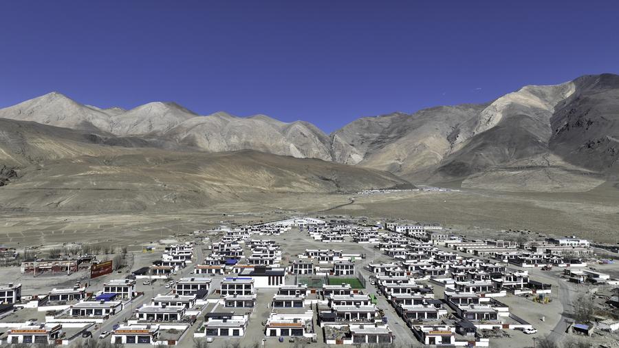 12日、ティンリ県野江村に並ぶ被災者向けの新築住宅。(ドローンから、シガツェ=新華社記者/姜帆)