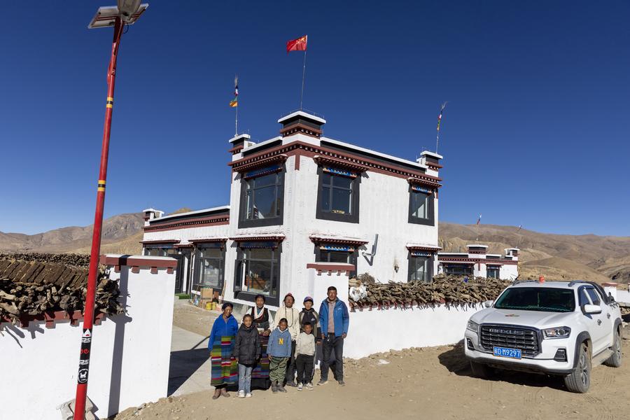 12日、ティンリ県熱木青村の新居と自家用車の前で記念寫真に納まる一家。(シガツェ=新華社記者/姜帆)