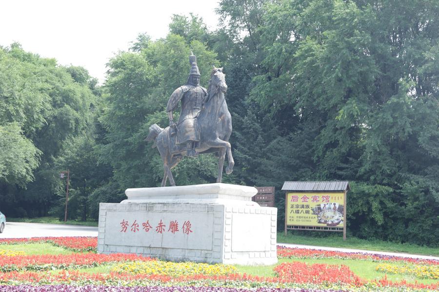 ヘトゥアラ城に立つヌルハチ像。(7月4日撮影、撫順=新華社記者/藍建中)