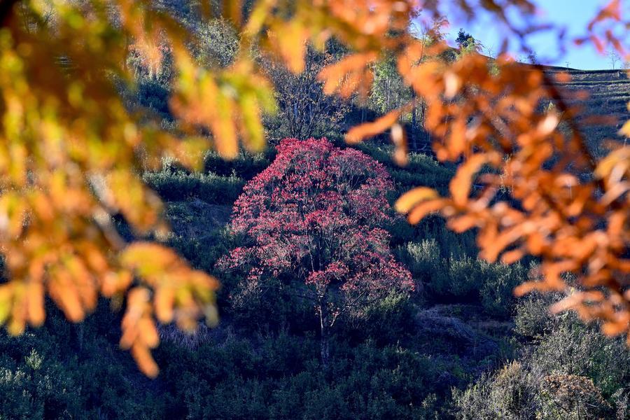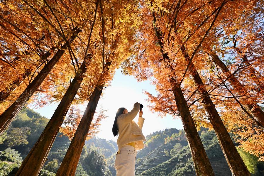 【新華社武夷山12月5日】中國福建省武夷山市でこのほど、カエデやメタセコイアが色づき、見頃を迎えた。山あいに點在する林は青空や水辺の風景と調和し、観光客らの目を楽しませている。