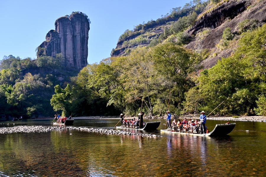 11月30日、福建省武夷山市を流れる九曲渓で竹製のいかだに乗る観光客。(武夷山=新華社記者/姜克紅)