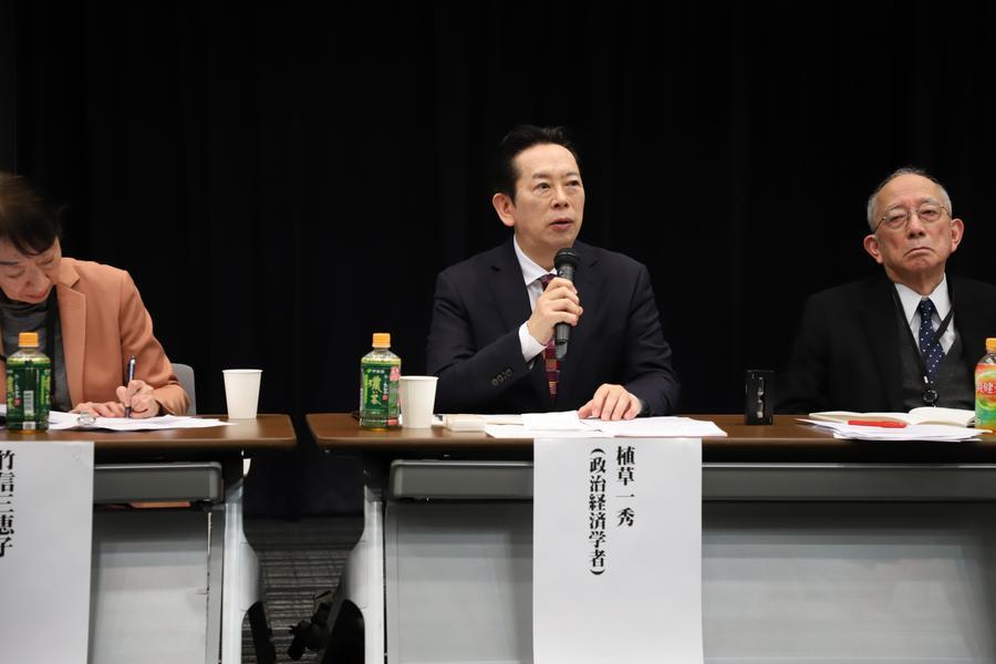 8日、記者會見で発言する政治経済學者の植草一秀氏(中央)。(東京=新華社記者/李子越)