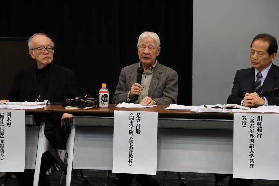 8日、記者會見で発言する雑誌「世界」元編集長・元岩波書店社長の岡本厚氏(中央)。(東京=新華社記者/李子越)