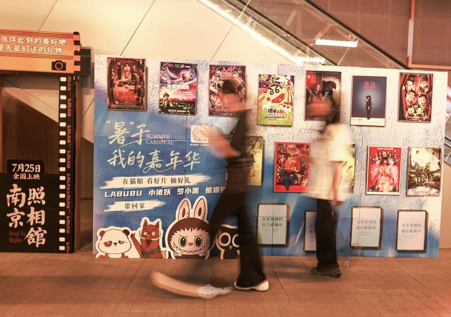 湖北省武漢市にある映畫館でポスターの前を通る人たち。(8月25日撮影、武漢=新華社配信/趙軍)