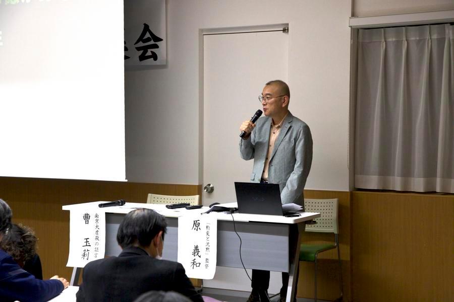 11日、東京で開催された南京大虐殺証言集會で発言する映像ディレクター、原義和さん。(東京=新華社記者/李子越)