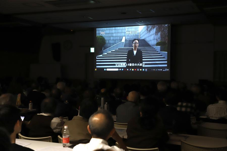 11日、東京で開催された南京大虐殺証言集會で、映像を通して証言を行う、南京大虐殺生存者の娘である曹玉莉(そう・ぎょくり)さん。(東京=新華社記者/李子越)
