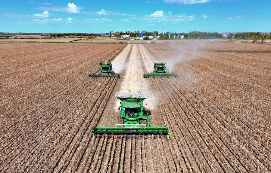 黒竜江省黒河市の農場で大豆を収穫する農機。(9月29日、ドローンから、黒河=新華社配信/陸文祥)