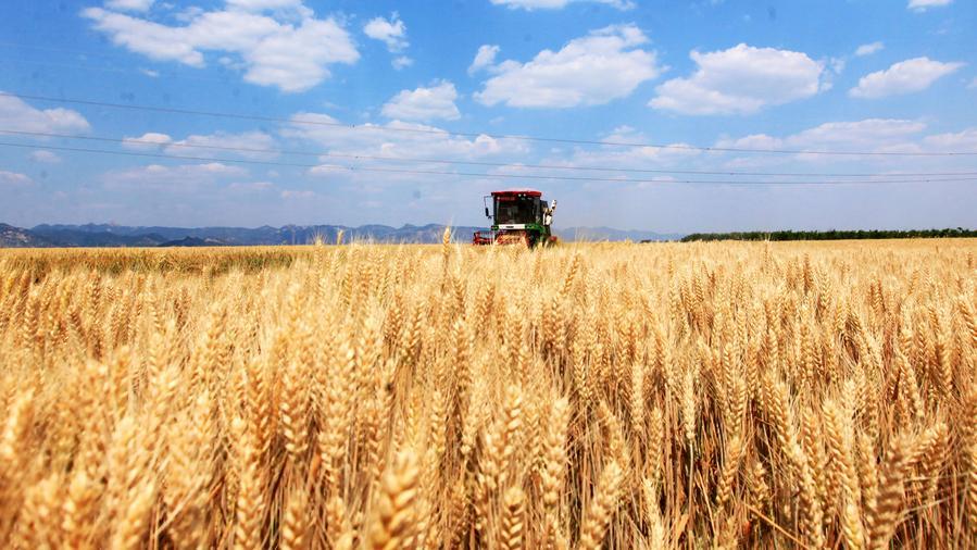 山東省臨沂市平邑(へいゆう)県で、小麥を収穫するコンバイン。(5月24日撮影、臨沂=新華社配信/武紀全)